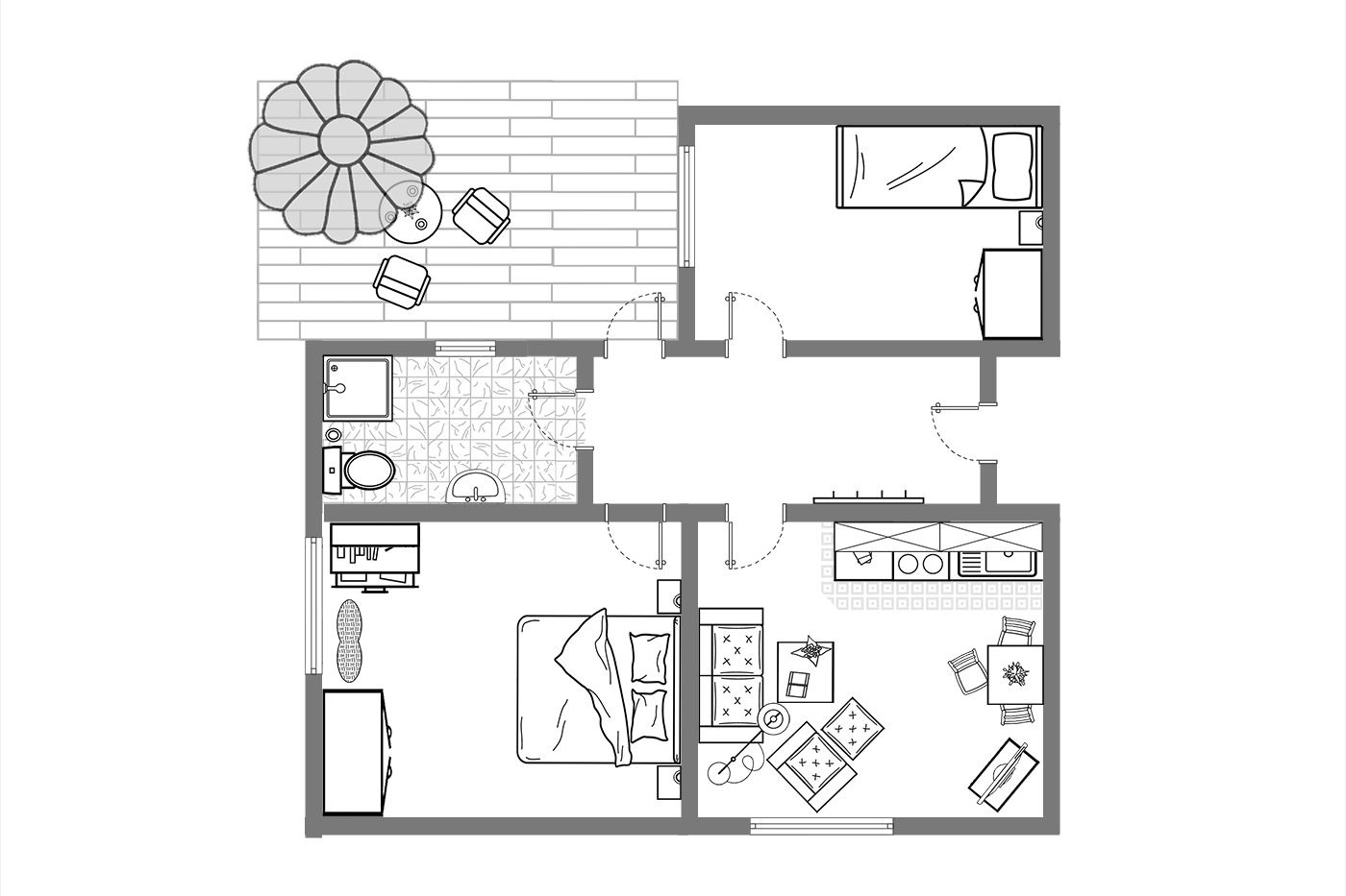 Im Bad befindet sich, für den bequemeren Einstieg, eine ebenerdige Dusche. Die beiden Schlafzimmer sind gemütlich eingerichtet, viel Wert wurde dabei auf das Mobiliar aus Echtholzmöbeln gelegt. Vom Wohnungsflur gelangen Sie direkt auf die Terrasse, die sich sowohl für ein gemütliches Frühstück, wie auch zum Ausklang am Abend anbietet.
